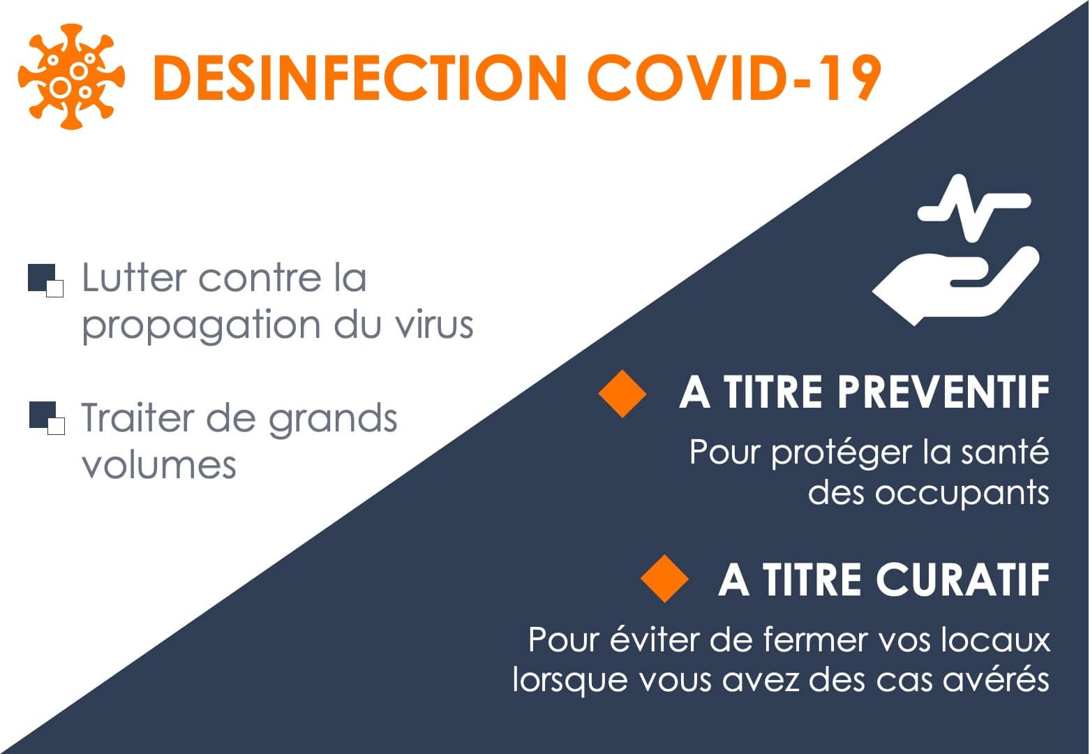 -A titre curatif : lorsque vous avez des cas avérés dans vos bureaux, agences, parties communes, logements, afin d’éviter leur fermeture, y compris pour les grands volumes.